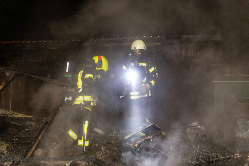 Zunächst wurde die Wache 1 zu einem Einsatz mit unklaren Feuerschein in einer Gartenanlage alarmiert. Auf Anfahrt der ersten Kräfte, konnte der Leitstelle bereits der Feuerschein bestätigt werden. Vor Ort stellte der Einsatzführungsdienst den Vollbrand einer Gartenlaube und den Übergriff auf eine zweite Gartenlaube fest. Umgehend wurde auf Kategorie "Brand mittel" erhöht, in Folge weitere Wachen alarmiert. Zur Absicherung zog man Rettungsdienst und die Polizei hinzu. Ebenfalls an der Einsatzstelle, die Stadtwerke Meiningen.