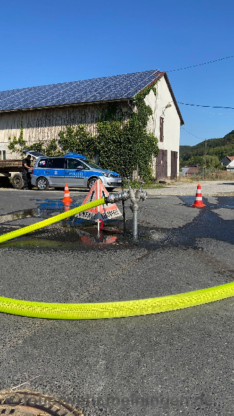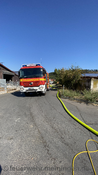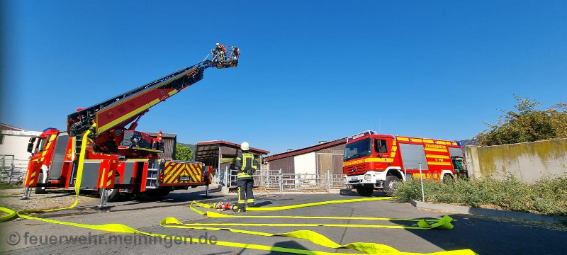 Löschzug Meiningen zur Kontrolle des Daches mittels DLK; Bereitstellung weiterer Atemschutzgeräteträger; Aufbau Wasserversorgung von Unterflurhydrant und Führungsstelle über den ELW.